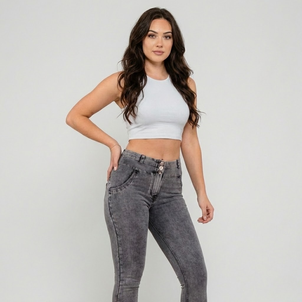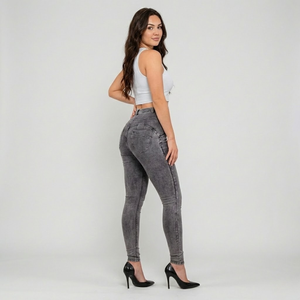 Estas calças de ganga skinny apresentam um corte justo que realça a silhueta de forma elegante e confiante. A cintura subida proporciona um ajuste confortável e favorecedor, ideal para looks de moda feminina que equilibram praticidade e estilo. A lavagem cinzenta confere um toque moderno e versátil, fácil de combinar em coordenados casuais ou mais sofisticados. O tecido com elasticidade acompanha os movimentos do dia-a-dia sem perder a forma.