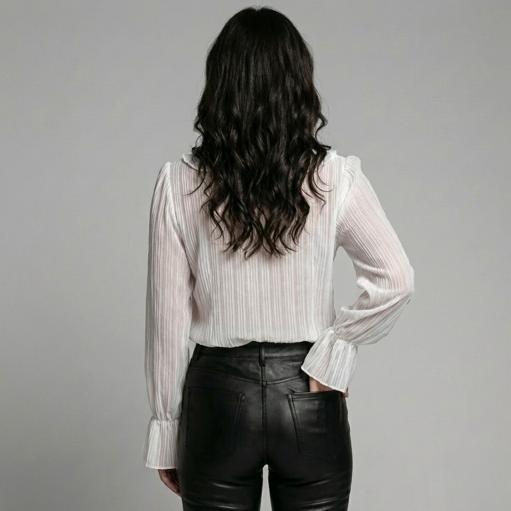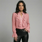 Blusa elegante em chiffon fluido | Corte feminino | Detalhe de folhos