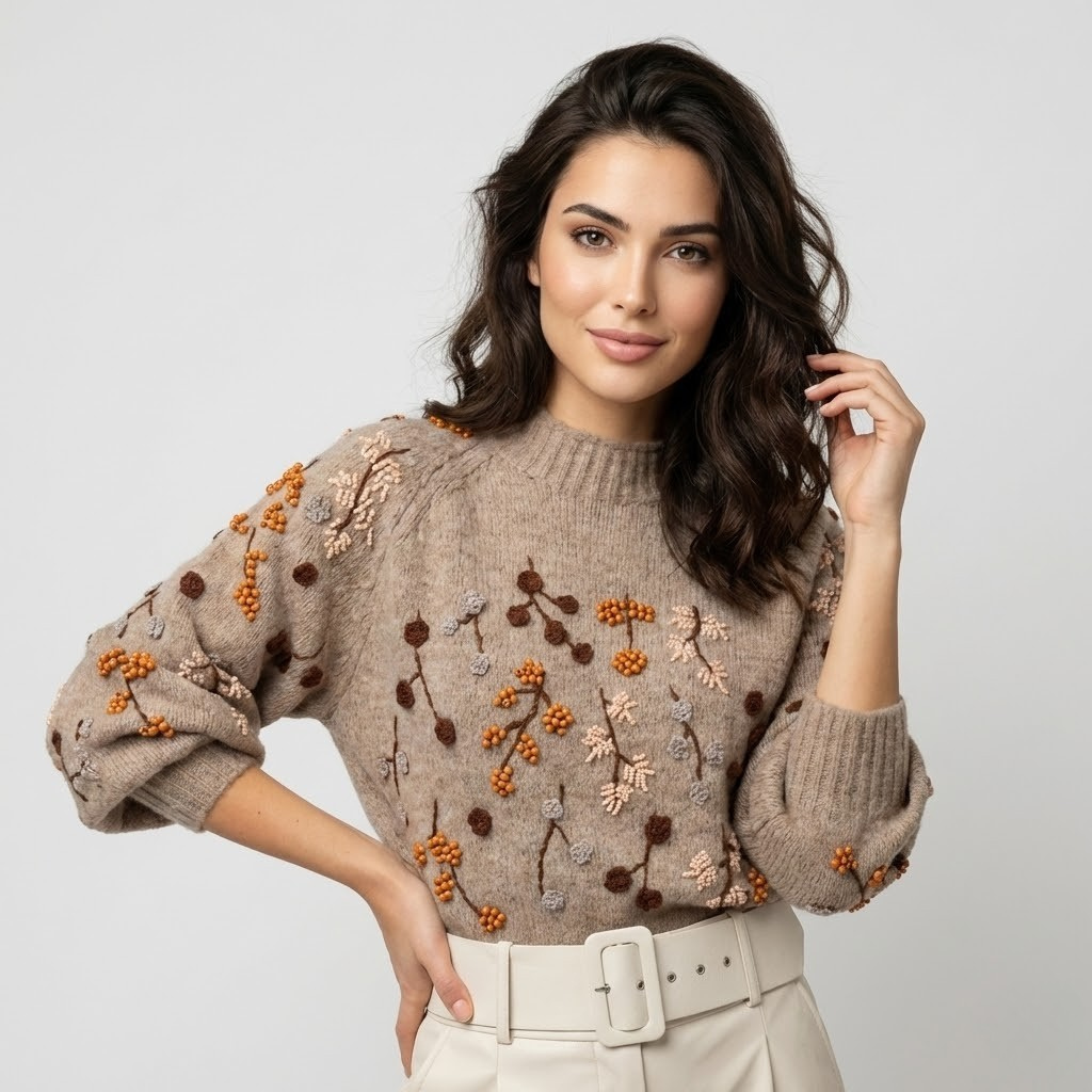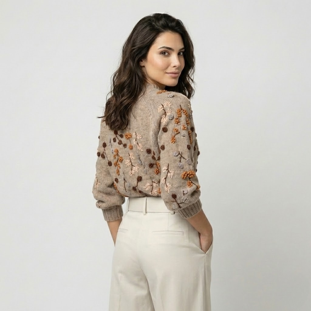 Esta camisola em malha macia distingue-se pelo delicado bordado floral artesanal, que acrescenta profundidade e carácter ao design. O corte estruturado equilibra conforto e sofisticação, enquanto as mangas com ligeiro volume conferem um toque contemporâneo e feminino. Ideal para compor looks de moda feminina elegantes ou coordenados casuais cuidados, é uma peça versátil para a meia-estação. O cuidado nos detalhes torna-a perfeita para quem valoriza qualidade e estilo no dia-a-dia.