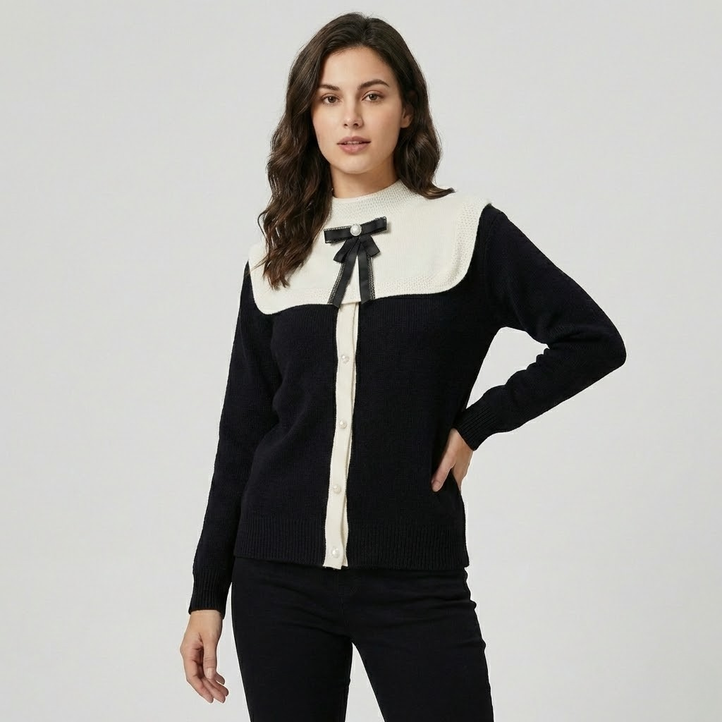 Camisola de malha elegante com gola contrastante | Corte clássico | Laço decorativo frontal