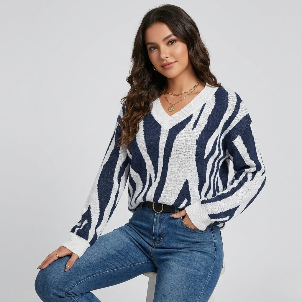 Esta camisola de malha destaca-se pelo seu padrão estampado expressivo, que confere personalidade e um toque contemporâneo ao visual. O corte regular garante conforto e versatilidade, adaptando-se facilmente a diferentes silhuetas. O decote em V alonga visualmente a linha do pescoço e acrescenta leveza à peça, equilibrando o grafismo do desenho. Ideal para a moda feminina atual, funciona tanto em looks de roupa casual como em combinações mais cuidadas.