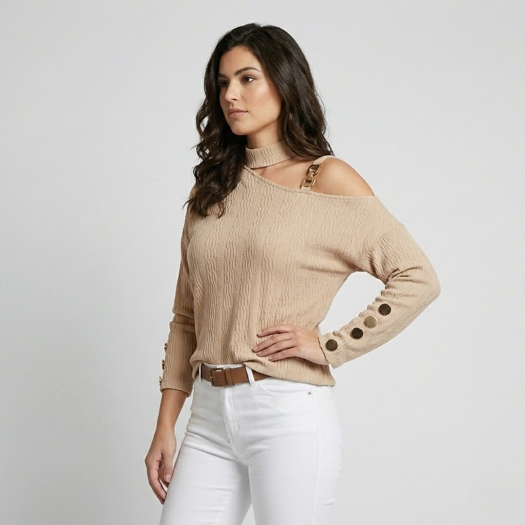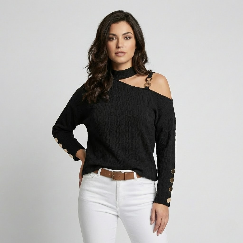 Camisola de malha texturada com decote assimétrico | Corte descontraído | Detalhe de alça com fivela