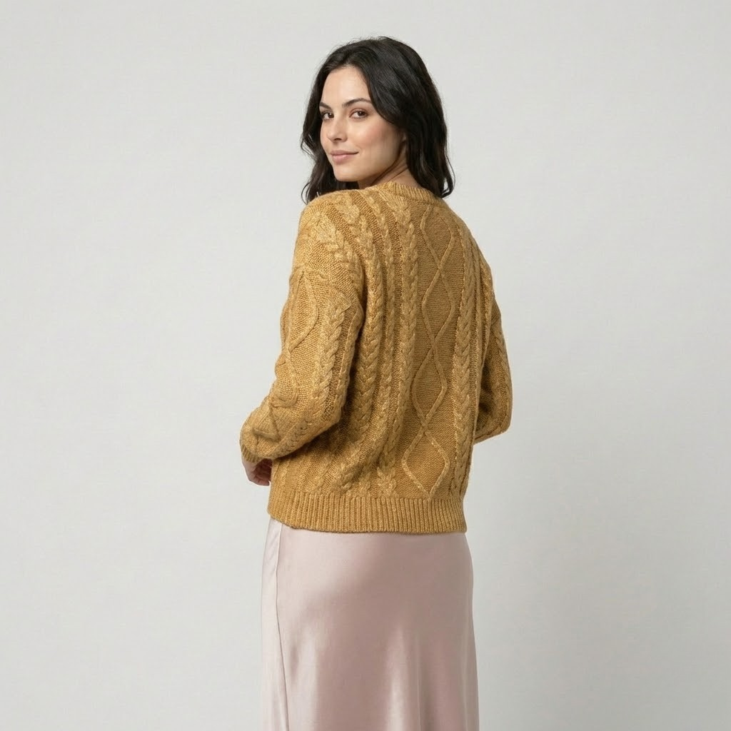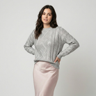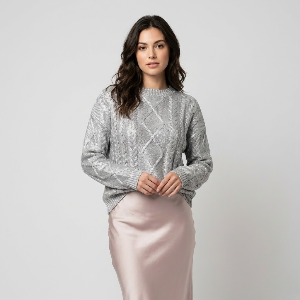 Esta camisola de malha distingue-se pelo trabalho em relevo com padrão geométrico, que acrescenta profundidade e sofisticação ao visual. O corte descontraído oferece conforto e um cair natural, ideal para o uso diário em contextos de moda feminina elegante ou casual. A textura rica da malha confere um aspeto cuidado sem esforço, perfeita para a meia-estação ou dias mais frescos. Versátil e intemporal, adapta-se facilmente a diferentes silhuetas e combinações.