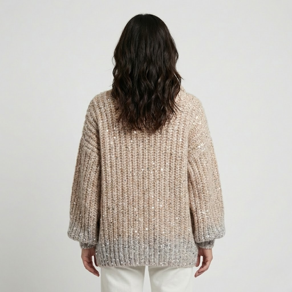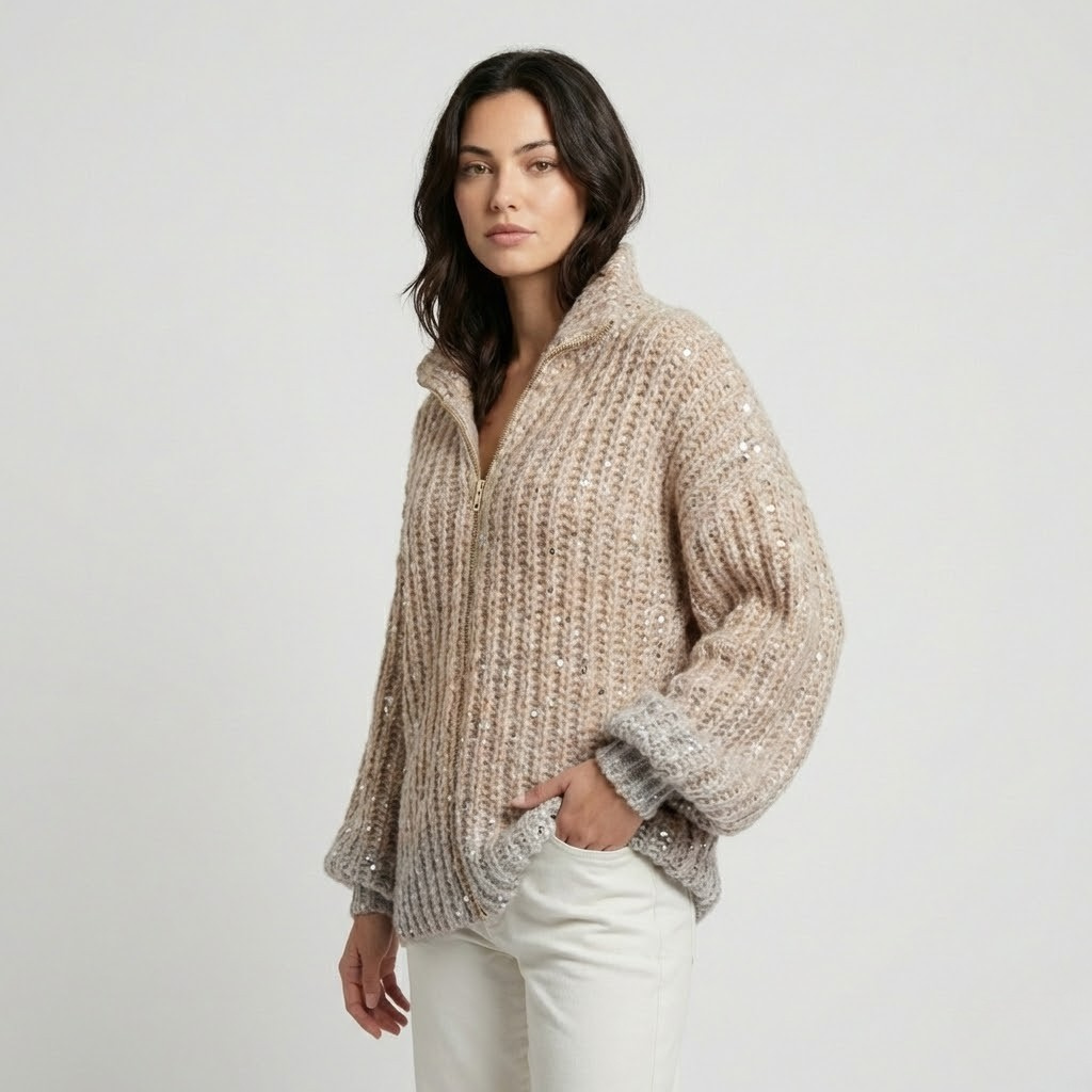 Camisola de malha volumosa com brilho subtil | Corte amplo | Fecho frontal com gola alta
