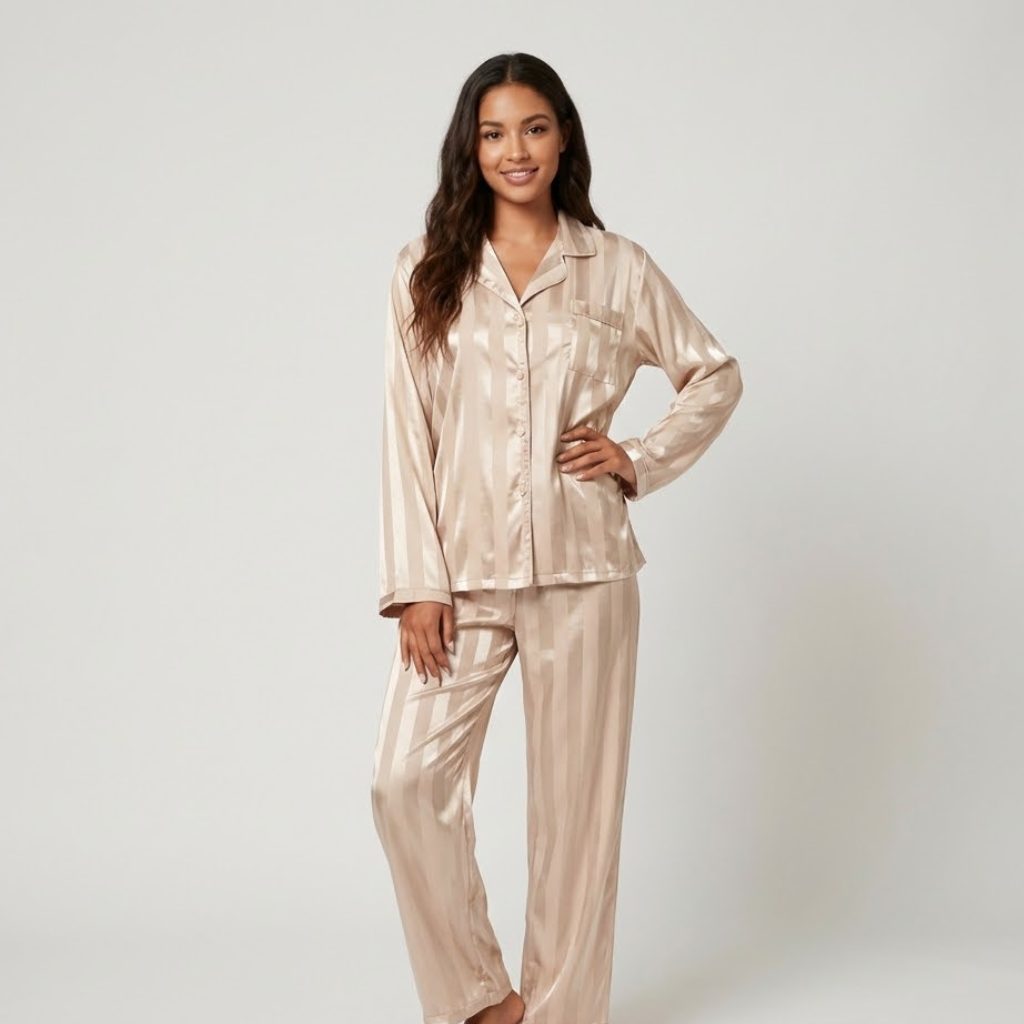 Este conjunto pijama em tecido acetinado destaca-se pelo seu acabamento luminoso e pelo padrão riscado discreto, que confere um toque elegante e intemporal. A camisa de corte fluido alia conforto e leveza, enquanto as calças de perna direita garantem um cair suave e natural. Ideal para quem valoriza roupa feminina confortável sem abdicar de uma estética cuidada, é perfeito tanto para uso em casa como para momentos de relaxamento mais sofisticados. A textura sedosa proporciona uma sensação agradável ao toque e um visual refinado.