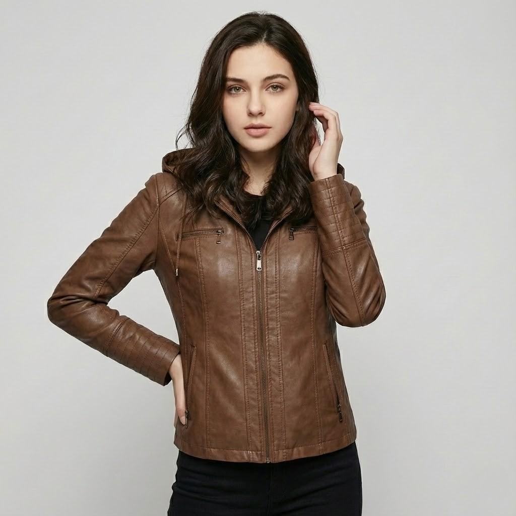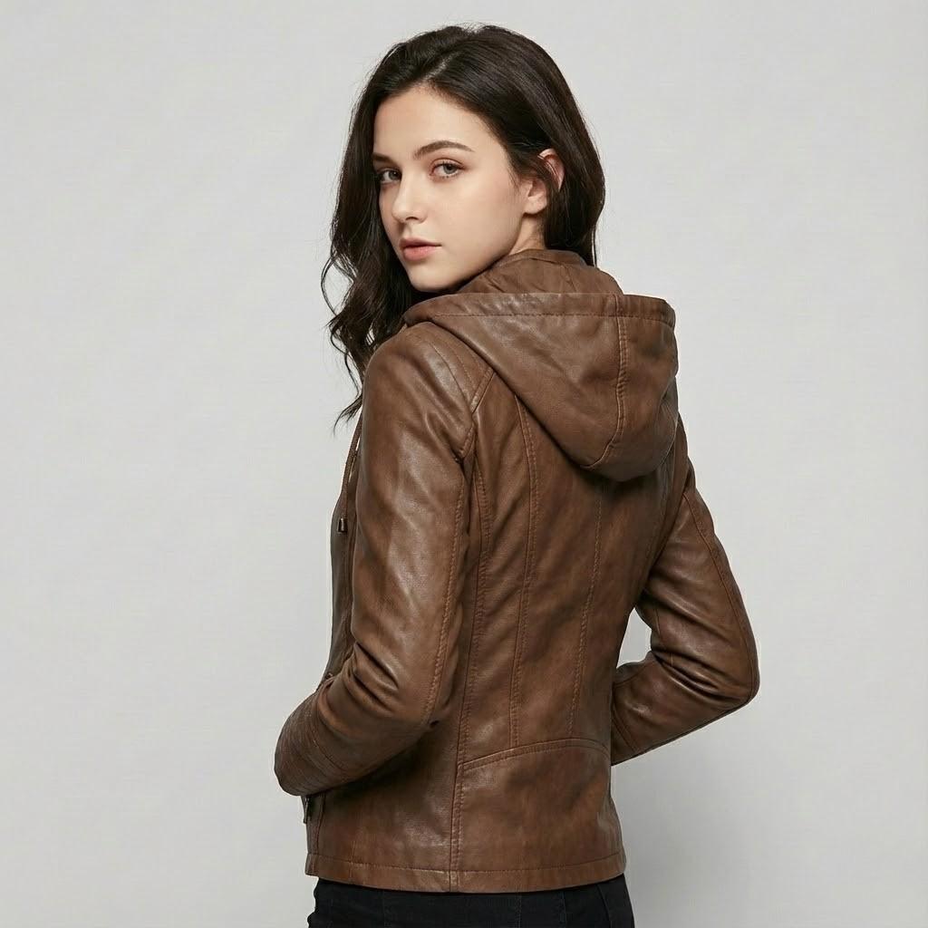 Jaqueta urbana em pele sintética | Corte cintado | Capuz funcional