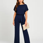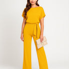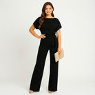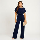 Macacão elegante de mulher com cinto ajustável e corte fluido