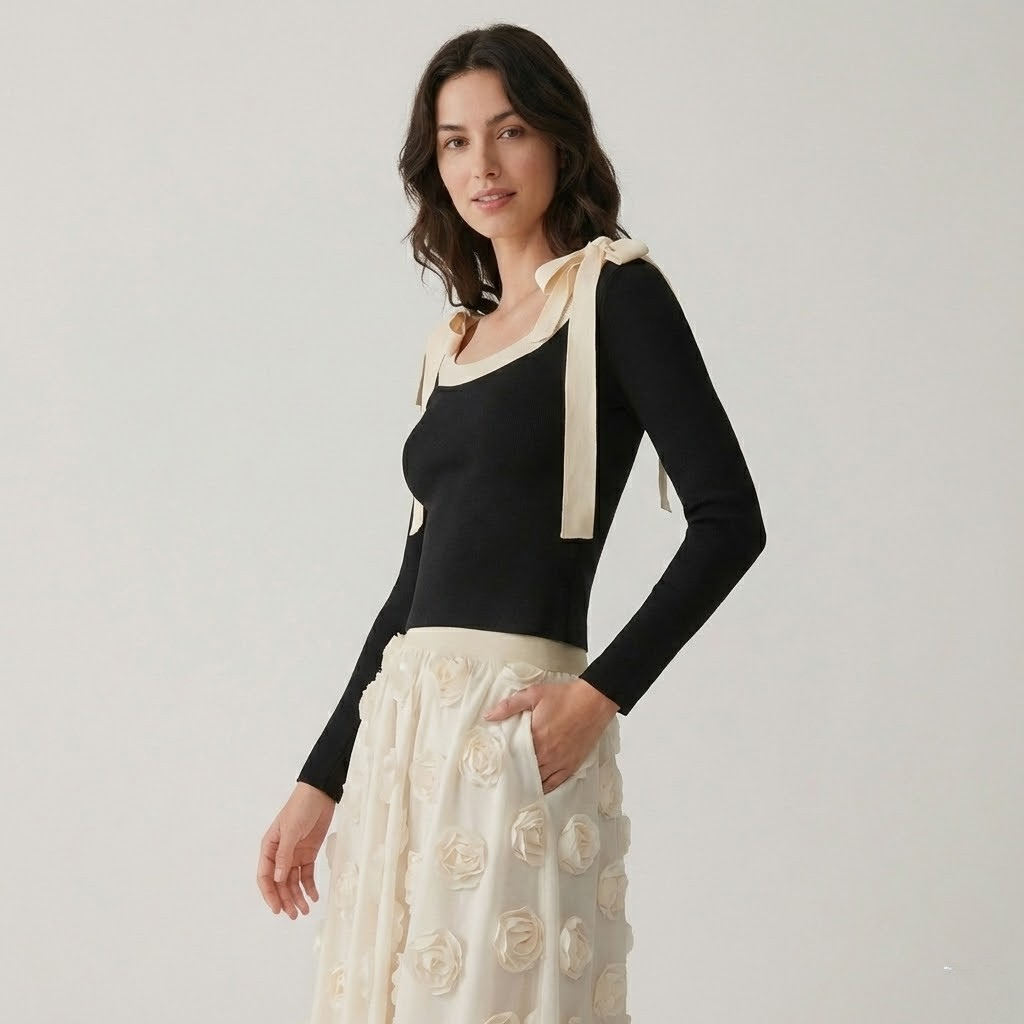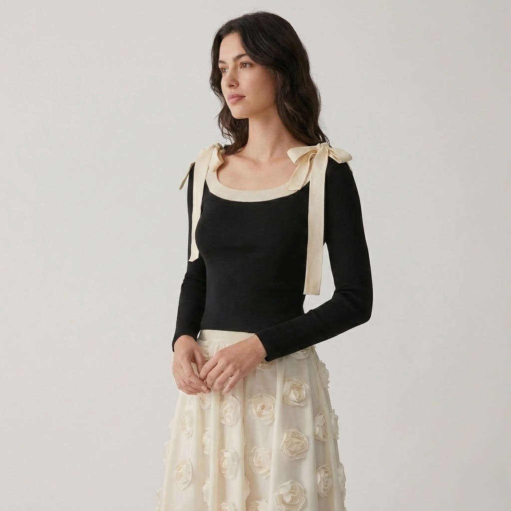 Este top de manga comprida combina uma silhueta ajustada com detalhes femininos cuidadosamente trabalhados, criando uma peça distinta e elegante. O decote amplo com acabamento contrastante valoriza a zona do colo, enquanto os laços decorativos nos ombros acrescentam um toque romântico e contemporâneo. Confortável e versátil, adapta-se facilmente a coordenados de moda feminina que transitam entre o casual e o sofisticado. Ideal para usar sozinho ou como base de conjuntos mais elaborados, mantém sempre uma presença elegante e atual.