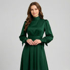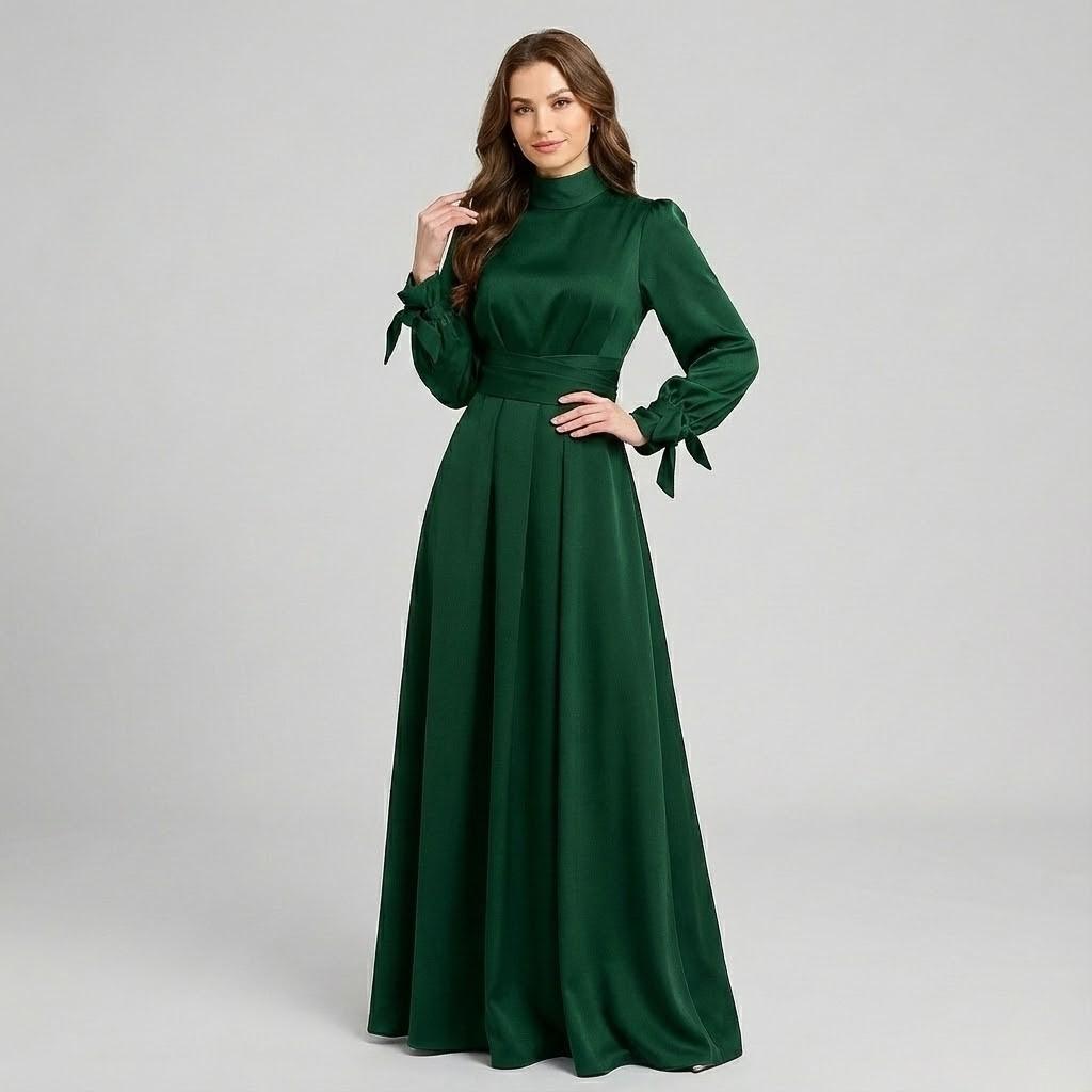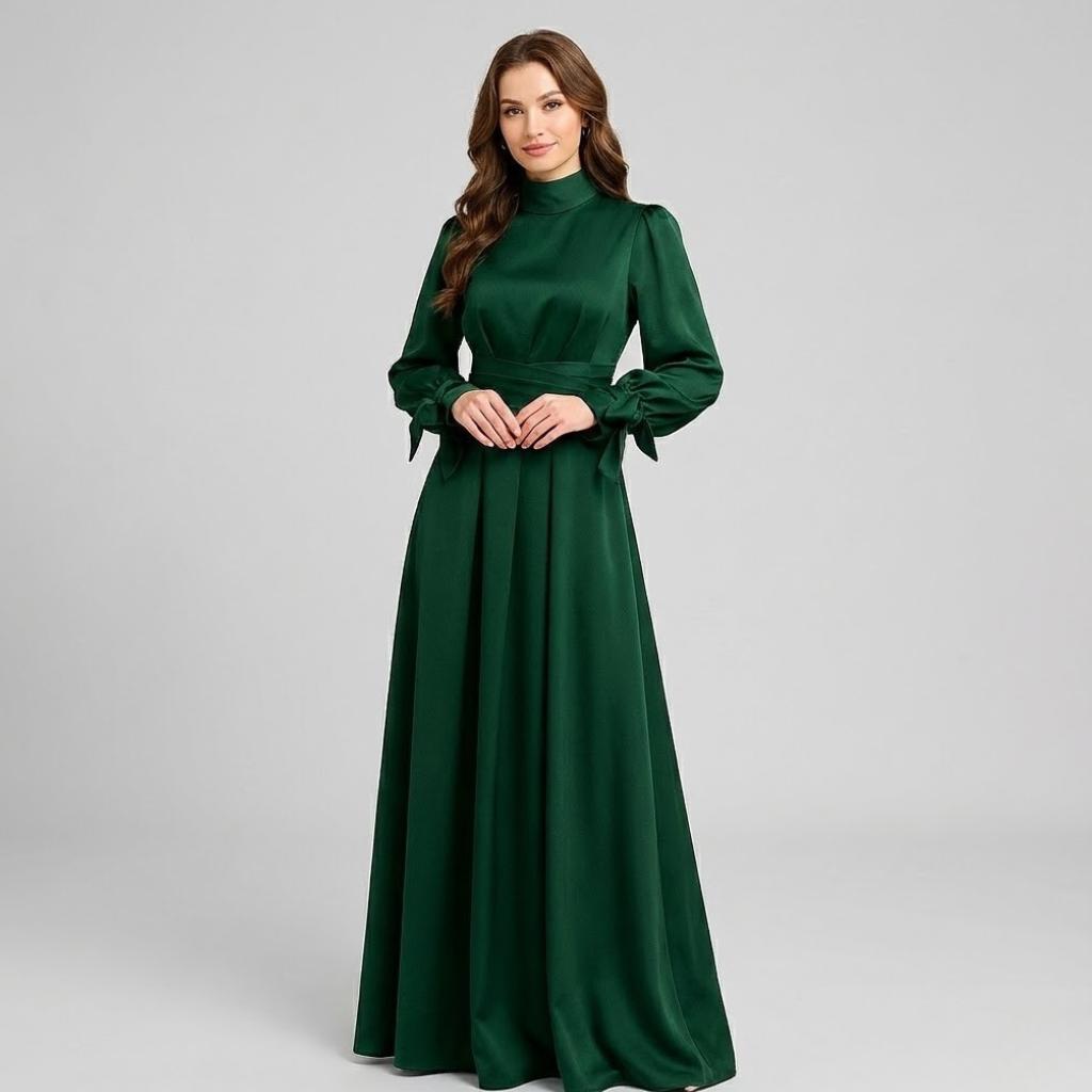 Vestido comprido elegante de mulher com gola alta e manga comprida fluida