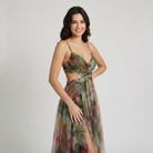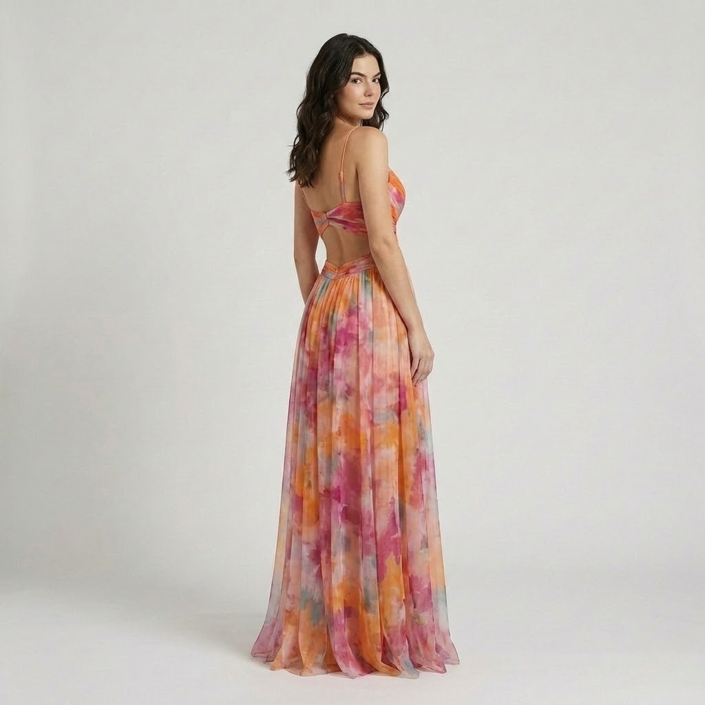 Este vestido comprido destaca-se pela sua silhueta fluida e pelo corte império que alonga a figura com naturalidade. O decote profundo em V confere feminilidade e sofisticação, enquanto a saia ampla e esvoaçante cria movimento leve a cada passo. O padrão artístico acrescenta personalidade sem perder a elegância, tornando-o ideal para eventos, cerimónias ou ocasiões especiais de verão. Uma proposta refinada da moda feminina, pensada para quem procura roupa elegante com impacto visual e leveza.