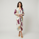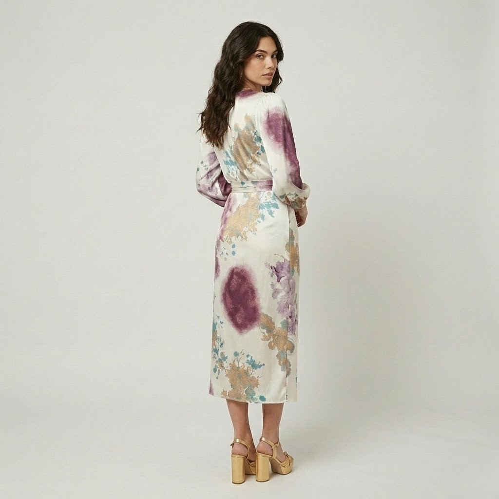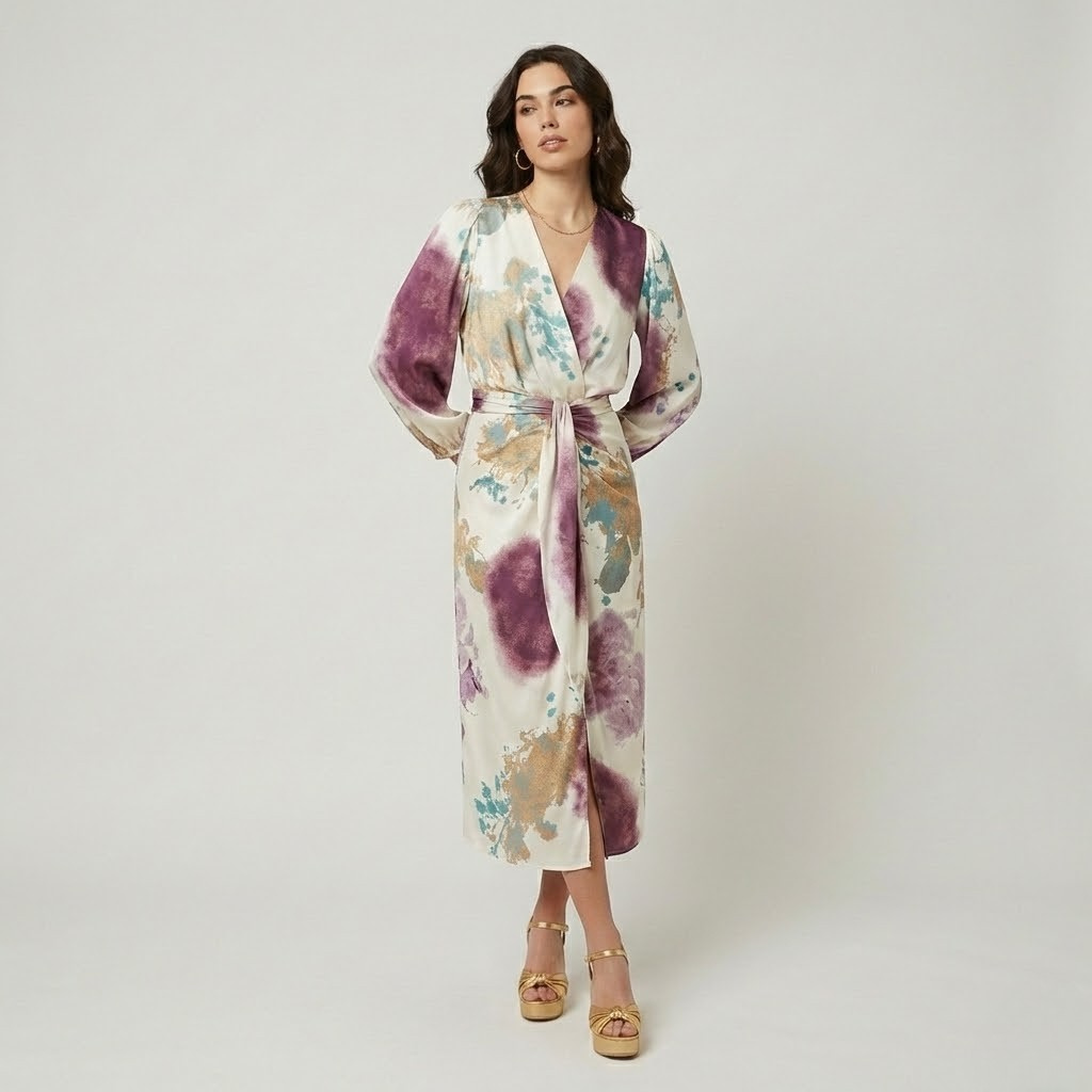 Vestido midi acetinado de inspiração artística | Corte envelope | Cintura ajustável elegante