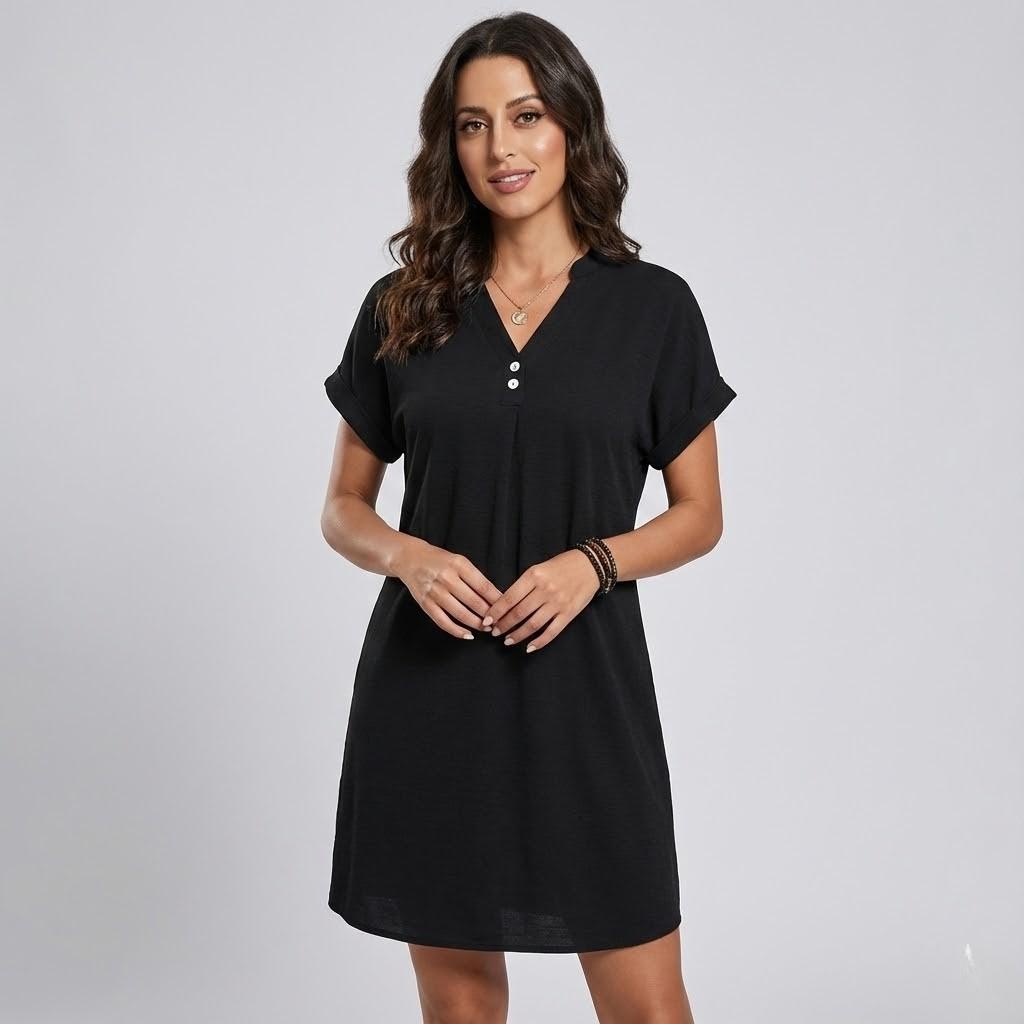 Este vestido mini feminino apresenta um corte fluido e descontraído, ideal para um dia-a-dia prático com um toque cuidado. A malha suave oferece conforto ao longo do dia, enquanto o decote em V com botões frontais acrescenta um detalhe simples e feminino. As mangas curtas reforçam a leveza da peça, tornando-a fácil de usar em diferentes momentos e contextos. Versátil e intemporal, integra-se com facilidade em propostas de moda feminina entre a roupa casual e a roupa elegante descontraída.