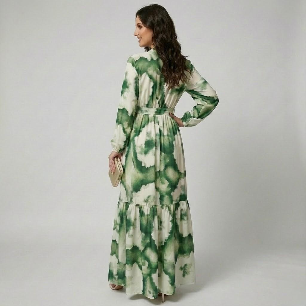 Vestido longo fluido em mistura de viscose | Corte evasé | Estampado artístico
