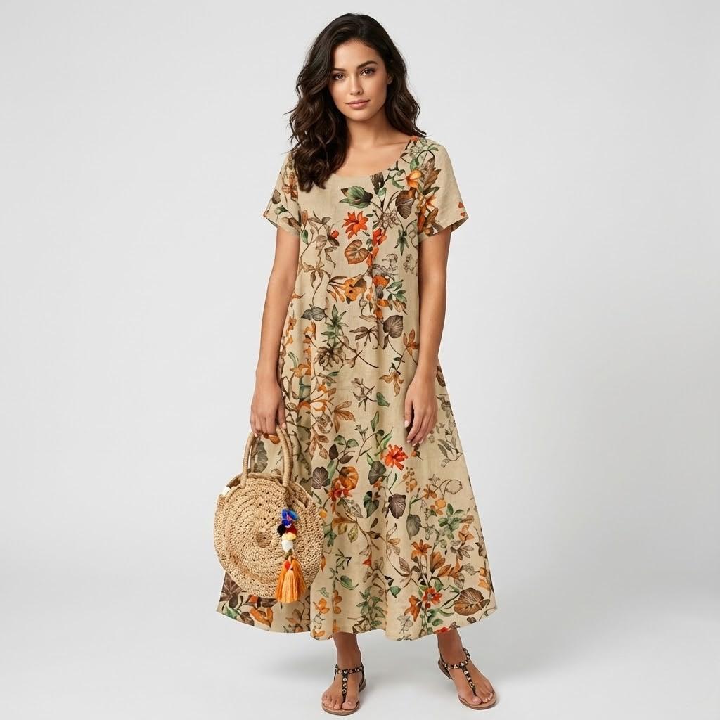 Vestido fluido com estampado floral em mistura de linho | Corte evasé | Leveza natural para o dia-a-dia