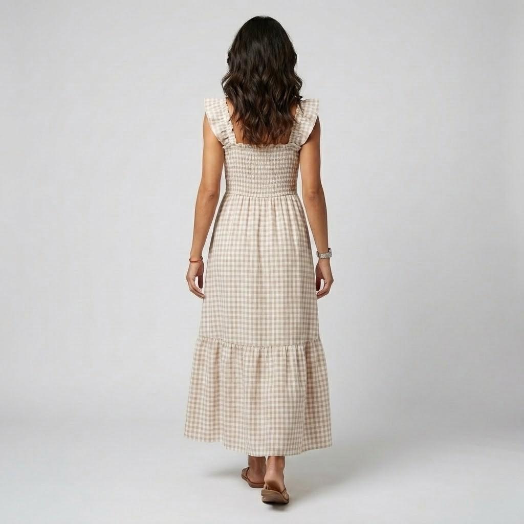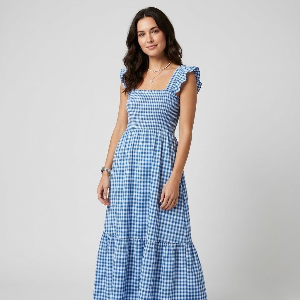 Vestido midi com padrão vichy em mistura de algodão | Corte cintado | Elegância leve de verão