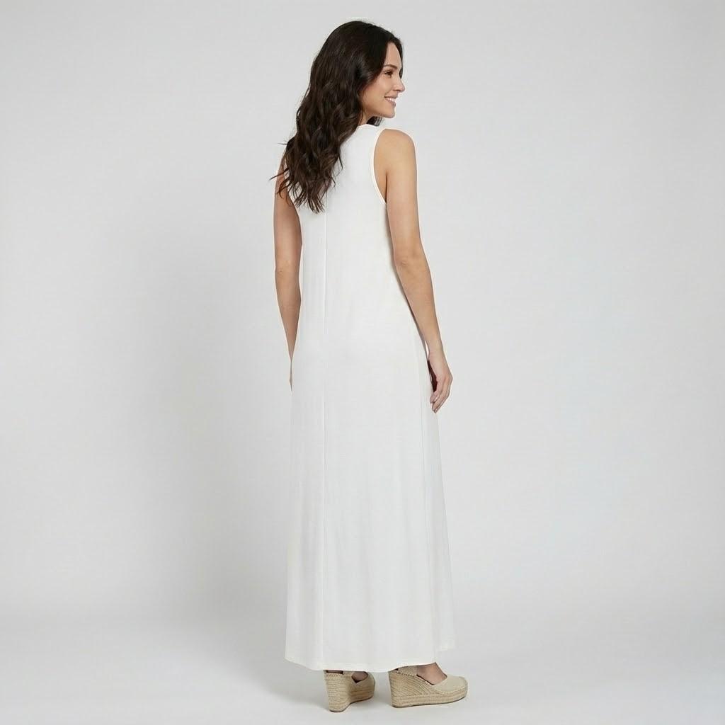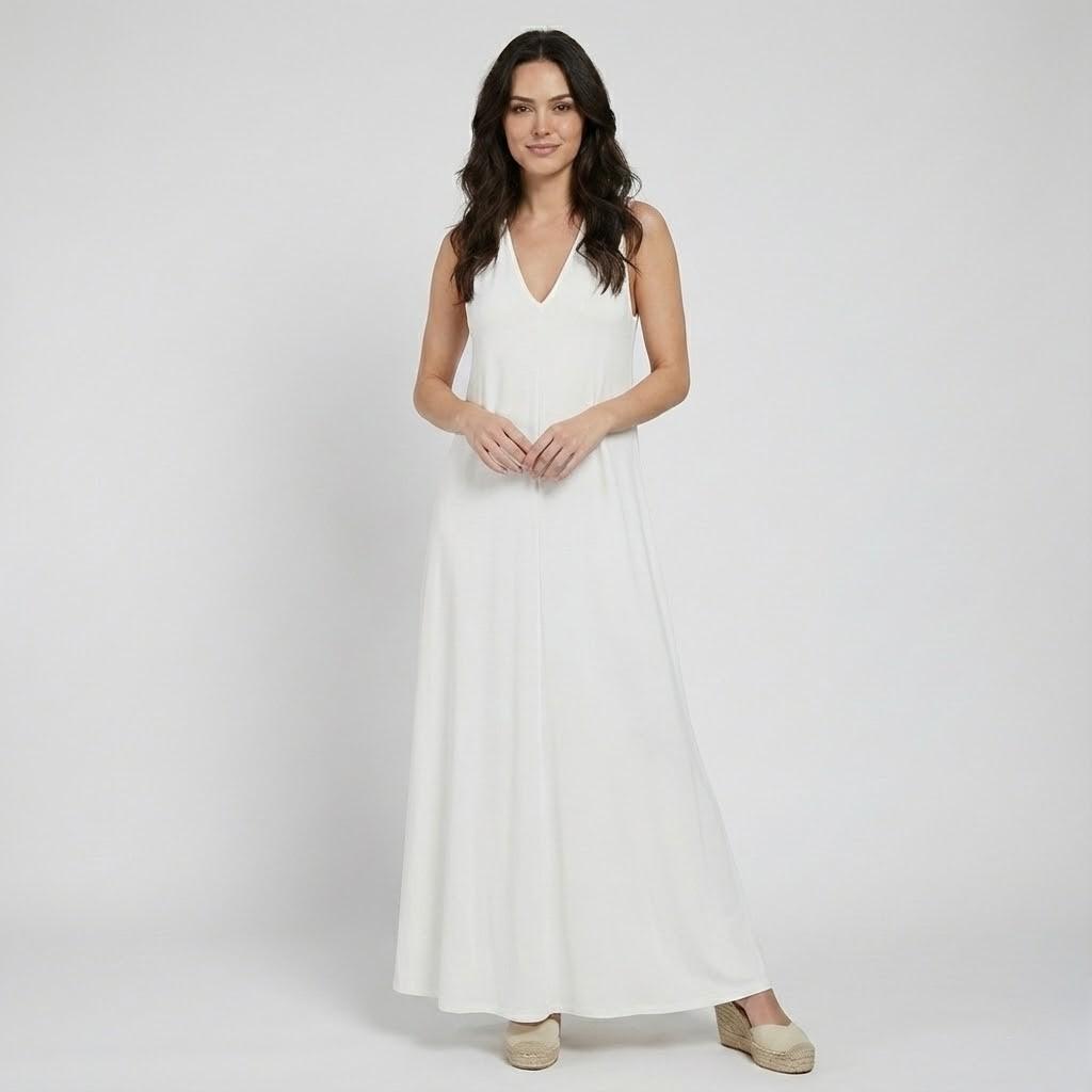 Vestido longo fluido com decote halter | Corte direito | Elegância leve e contemporânea