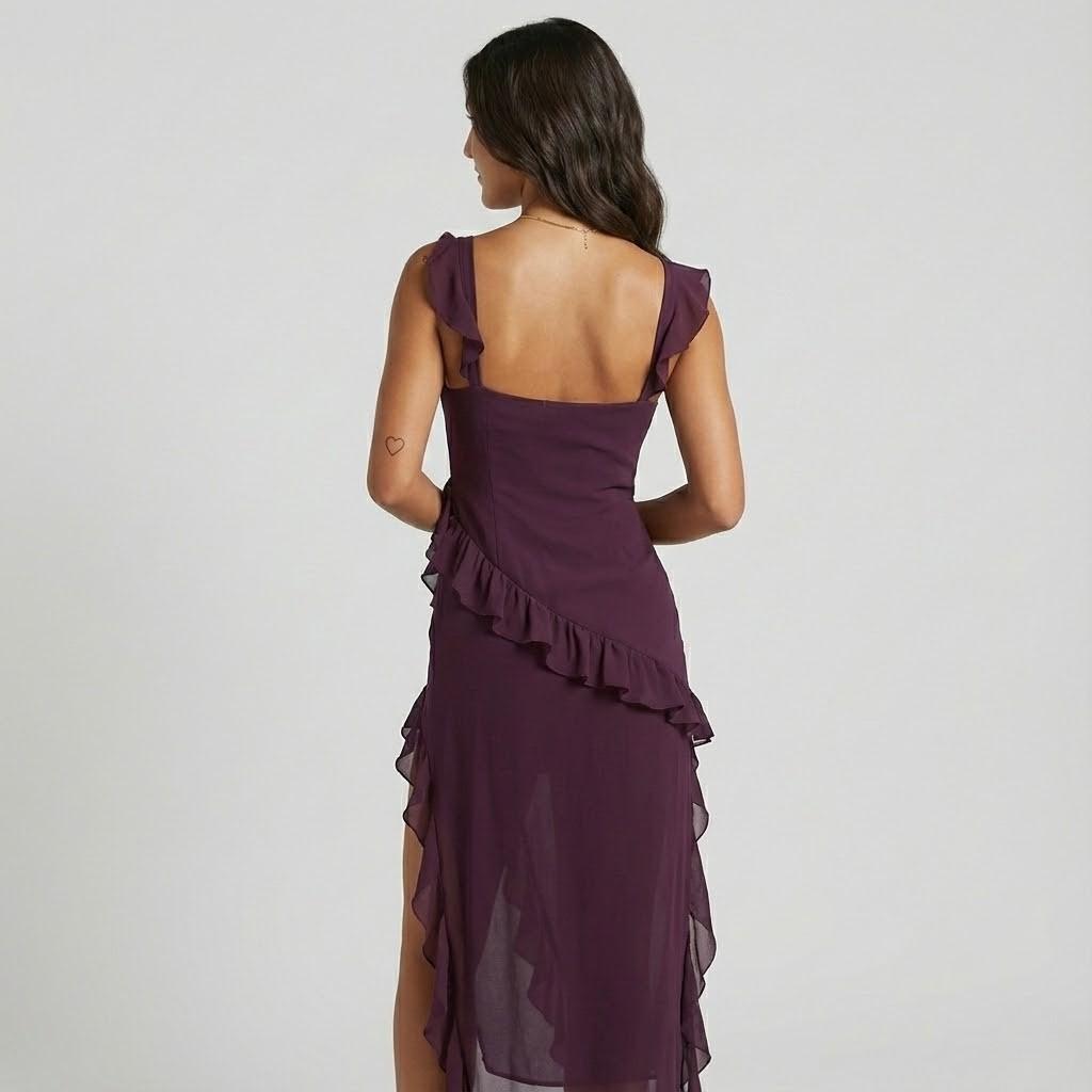 Vestido maxi elegante com alças delicadas | Silhueta fluida | Folhos assimétricos femininos