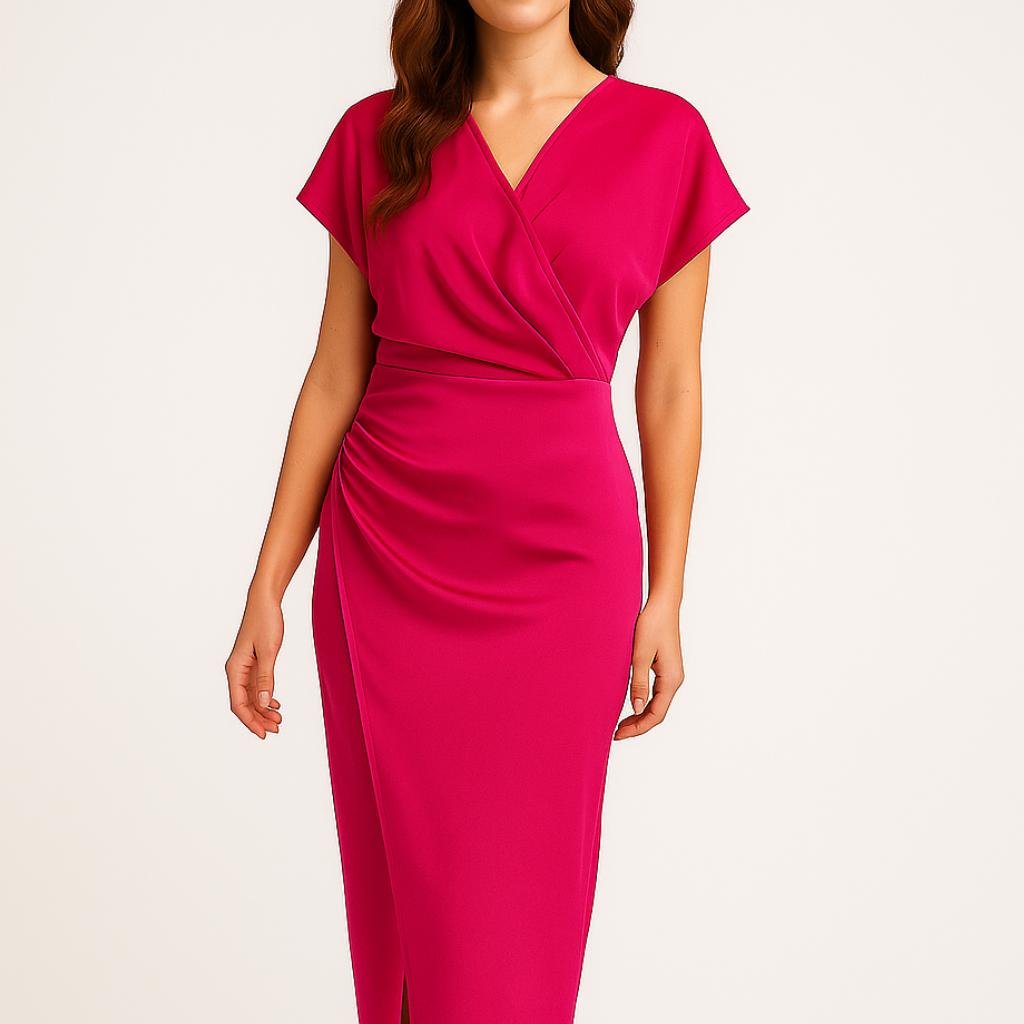 Vestido Elegante Midi com Decote em V e Fenda Frontal