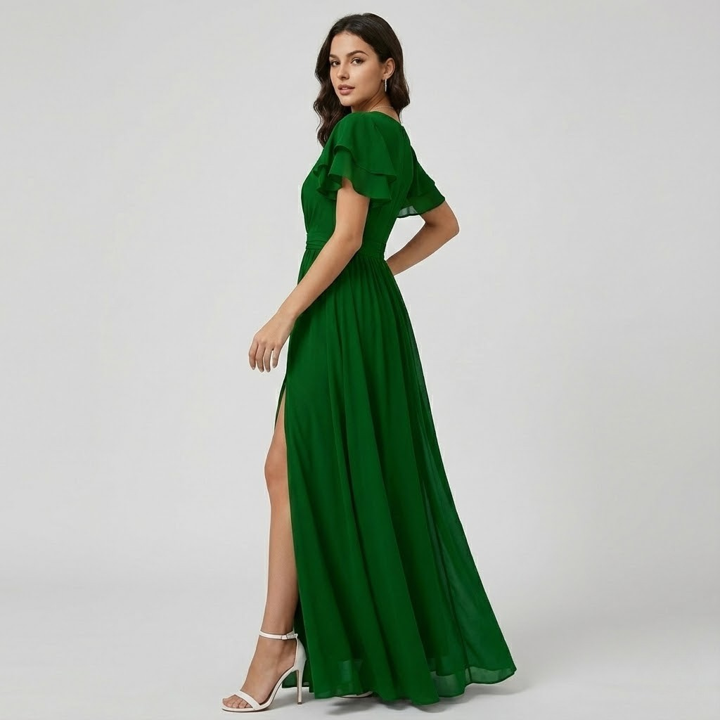 Vestido longo elegante em tecido fluido | Decote em V | Detalhe de folhos