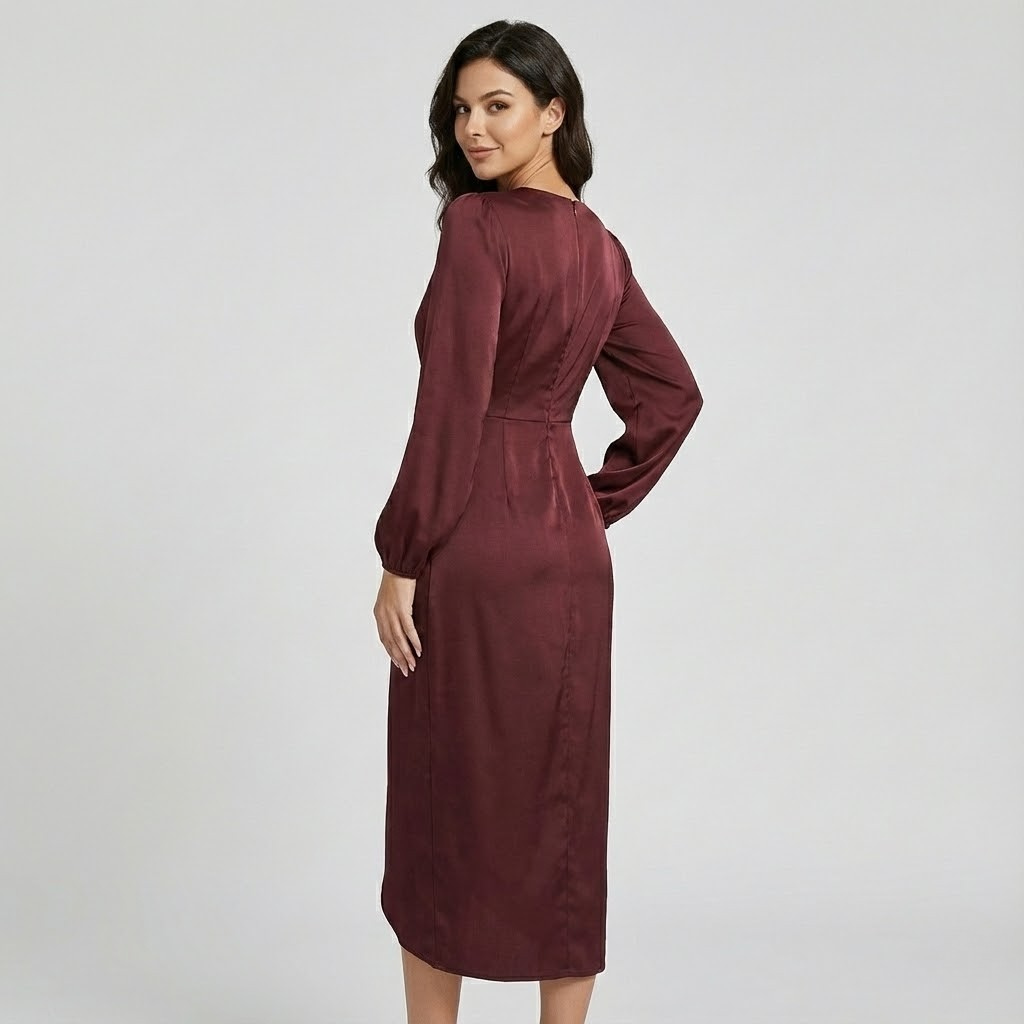 Vestido midi elegante em viscose fluida | Corte ajustado | Drapeado feminino sofisticado