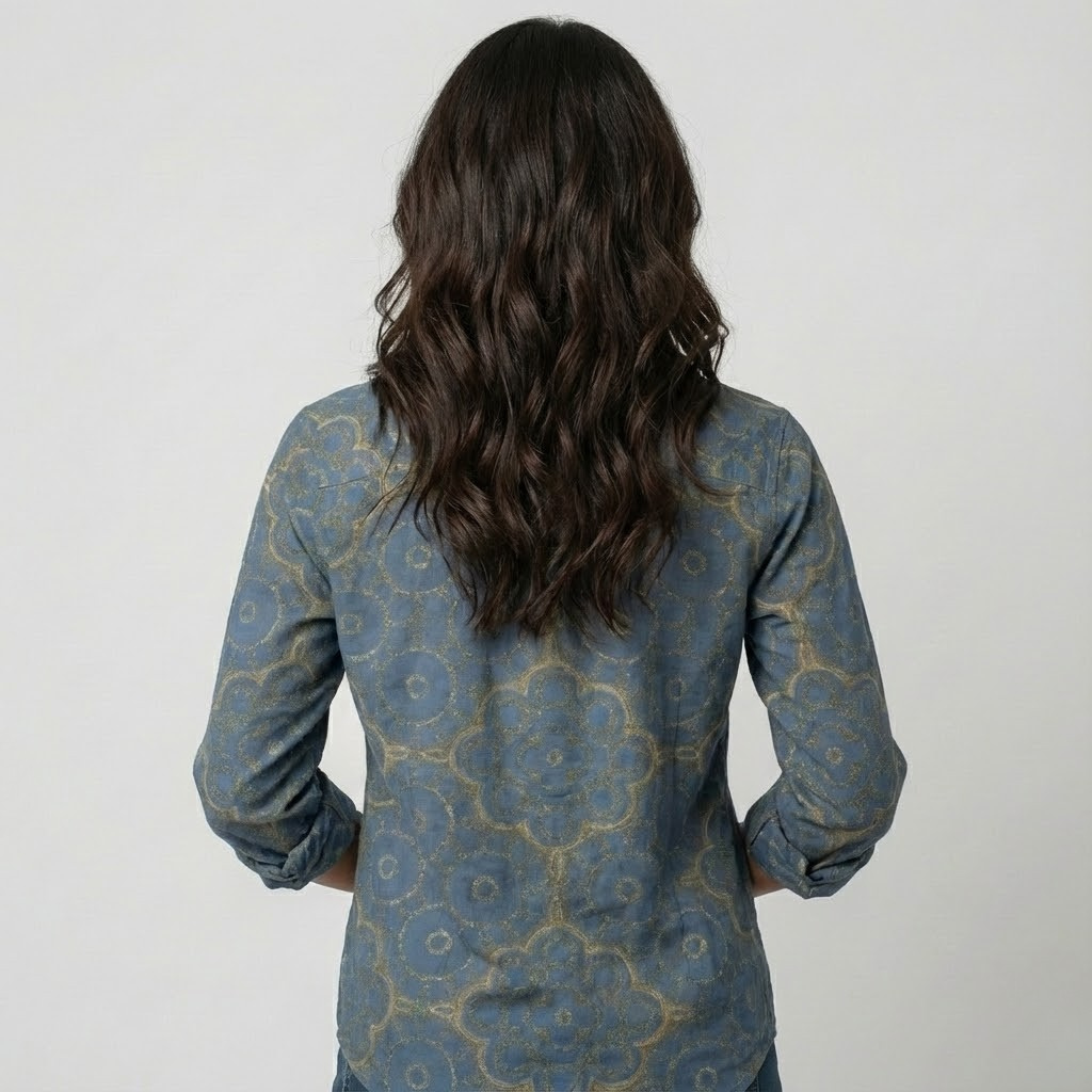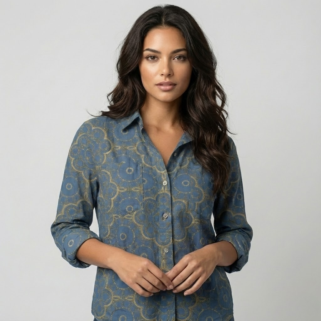 Blusa elegante estampada em tecido fluido | Corte feminino | Detalhes delicados