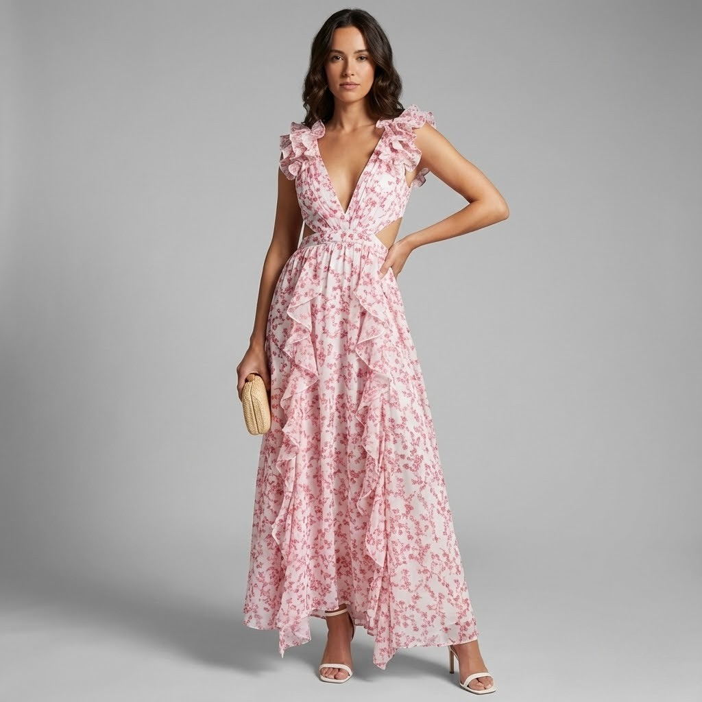 Vestido maxi elegante em tecido fluido | Corte cintado | Detalhes românticos