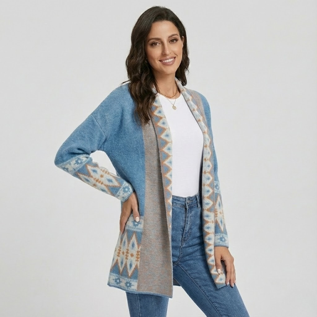 Cardigan fluido em malha suave | Corte solto | Padrão inspirado no boho