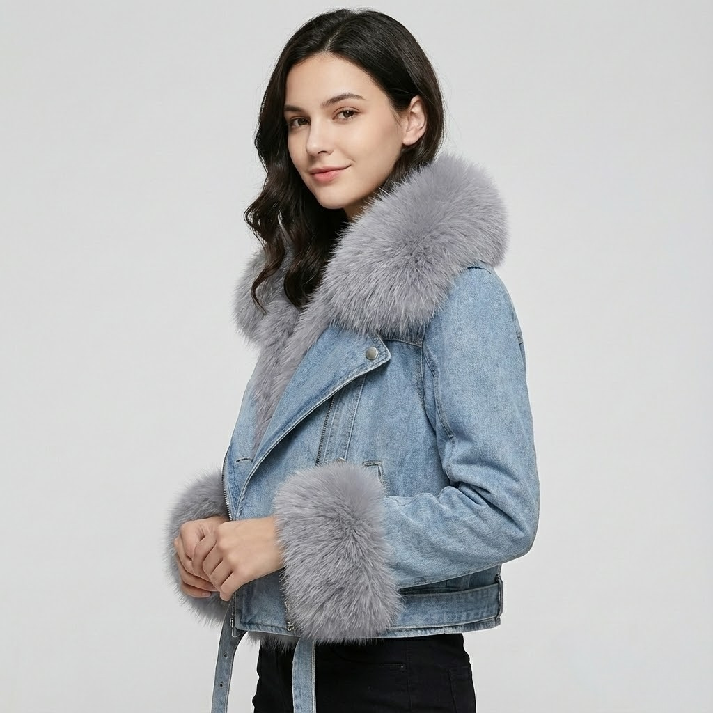 Casaco curto em denim | Corte estruturado | Detalhes em pelo sintético